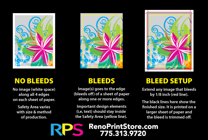 Bleed is the part of your image that is extended beyond the finished size of your print. Bleed prevents the unprinted paper from showing on the edges of your finished job when it is cut to size.